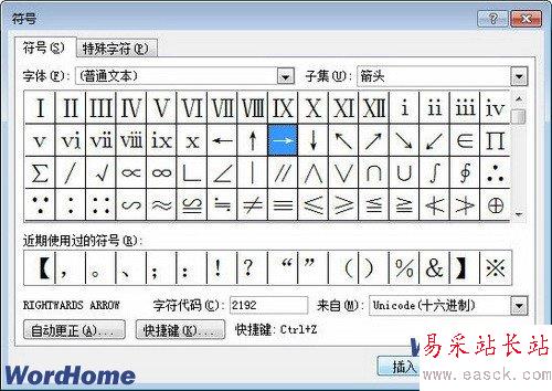 第3步,打開“符號”對話框,在“符號”選項卡中單擊“子集”右側的下拉三角按鈕,在打開的下拉列表中選中合適的子集(如“箭頭”)。然后在符號表格中單擊選中需要的符號,并單擊“插入”按鈕即可,如圖3所示。