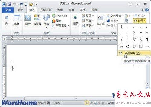 第1步,打開Word2010文檔窗口,切換到“插入”功能區。在“符合”分組中單擊“符號”按鈕,如圖1所示。