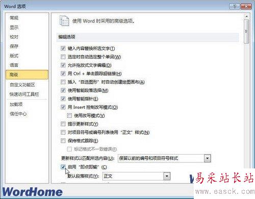 第2步,在打開的“Word選項”對話框中切換到“高級”選項卡,在“編輯選項”區域選中“啟用‘即點即輸’”復選框,并單擊“確定”按鈕,如圖2所示。