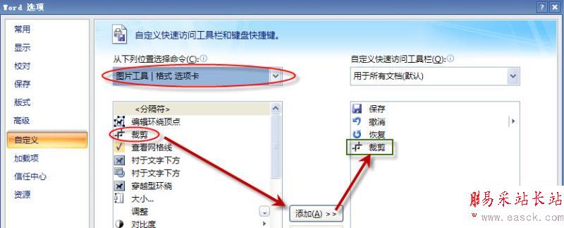 步驟2.步驟1圖中藍(lán)色箭頭所指處,下拉菜單選擇【圖片工具|格式選項(xiàng)卡】,在下方選擇【裁剪】按鈕并添加至右方快速訪問工具欄
