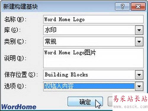 第2步,打開“新建構(gòu)建基塊”對(duì)話框,用戶可以自定義構(gòu)建基塊名稱,并選擇構(gòu)建基塊保存到的庫(kù)。默認(rèn)情況將保存到“文檔部件”庫(kù)中,當(dāng)然也可以選擇保存到“頁(yè)眉”、“頁(yè)腳”、“文本框”等庫(kù)中。選擇保存到哪個(gè)庫(kù),在使用該構(gòu)建基塊時(shí)就需要到相應(yīng)的庫(kù)中查找。其他選項(xiàng)保持默認(rèn)設(shè)置,并單擊“確定”按鈕,如圖2所示。