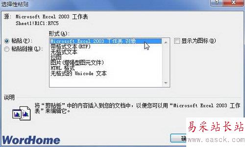 第3步,打開“選擇性粘貼”對話框,在“形式”列表中選中“Microsoft Excel 2003工作表對象”選項,并單擊“確定”按鈕,如圖2所示。