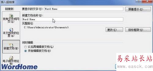第2步,打開“插入超鏈接”對話框,在“鏈接到”區域選中“新建文檔”選項。在“新建文檔名稱”編輯框中輸入新文檔的名稱,然后單擊“完整路徑”區域的“更改”按鈕選擇新文檔的保存位置。在“何時編輯”區域,選中“開始編輯新文檔”單選框將在完成創建超鏈接后打開新文檔,選中“以后再編輯新文檔”單選框將只創建超鏈接而不打開新文檔。設置完成單擊“確定”按鈕即可,如圖2所示。