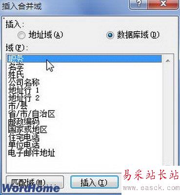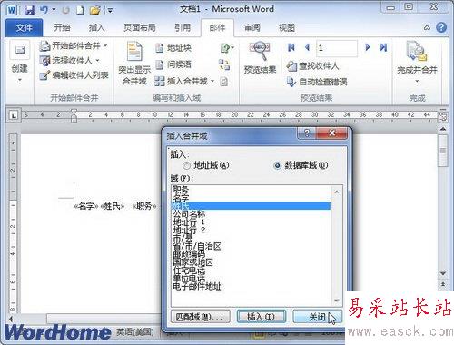 第3步,打開“插入合并域”對話框,在域列表中選中合適的域并單擊“插入”按鈕,如圖所示。