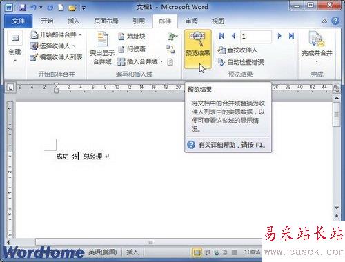 第5步,返回Word2010文檔窗口,在“預覽結果”分組中單擊“預覽結果”按鈕可以預覽完成合并后的結果,如圖4所示。