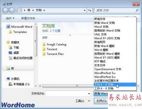 第2步,在打開的“打開”對話框中,單擊文檔類型下拉三角按鈕,選擇文檔類型為“工作6-9文檔”選項。然后查找并選中需要打開的WPS文檔,單擊“打開”按鈕即可,如圖2所示。