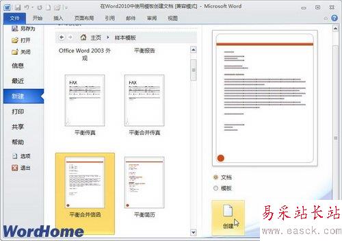 第3步,打開樣本模板列表頁,單擊合適的模板后,在“新建”面板右側(cè)選中“文檔”或“模板”單選框(本例選中“文檔”選項),然后單擊“創(chuàng)建”按鈕,如圖2009120502所示。