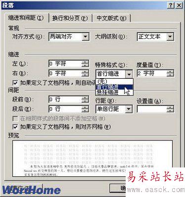 圖2010070801 單擊“段落”菜單命令第2步,在打開的“段落”對話框中,切換到“縮進和間距”選項卡。在“縮進”區域單擊“特殊格式”下拉三角按鈕,并在打開的下拉菜單中選擇“首行縮進”選項。然后在“度量值”文本框中單擊微調按鈕設置縮進的字符數(例如設置為最常用的2個字符),設置完畢單擊“確定”按鈕,如圖2010070802所示。
