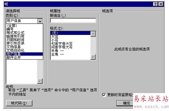 2. 當我們用Word完成一篇文章后,將光標置于需要插入個人資料的位置上,單擊【插入】→【域】命令,打開【域】對話框,在【類別】下拉列表中選擇【用戶信息】,然后在【域名】列表框中選擇 “UserAddress”,如下圖所示: