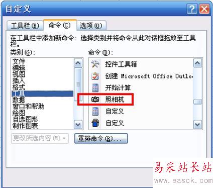 打開Excel,按以下順序依次點擊:視圖-工具欄-自定義,這樣就打開了自定義工具欄對話框。點擊“命令”標簽,從左側(cè)“類別”框找到“工具”,點擊,右側(cè)“命令”框列出了“工具”名下所有的命令,拖動滾動條找到照相機(如圖)。