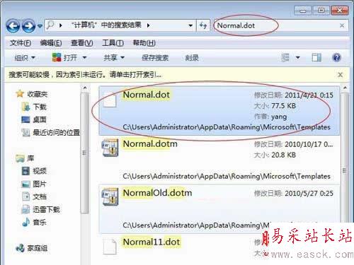 方法一:雙擊打開“計算機”在右上方的搜索框中輸入“Normal.dot”,此時Win7系統(tǒng)會自動搜尋名稱包含“Normal.dot”這個名稱的文件,搜索的結果可能有很多相似的文件,但你只需要找到“C:UsersAdministratorAppDataRoamingMicrosoft Templates”這個路徑下面的“Normal.dot”這個文件,然后將其刪除即可。