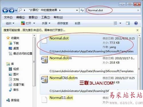 方法一:雙擊打開“計算機”在右上方的搜索框中輸入“Normal.dot”,此時Win7系統(tǒng)會自動搜尋名稱包含“Normal.dot”這個名稱的文件,搜索的結(jié)果可能有很多相似的文件,但你只需要找到“C:UsersAdministratorAppDataRoamingMicrosoft Templates”這個路徑下面的“Normal.dot”這個文件,然后將其刪除即可。