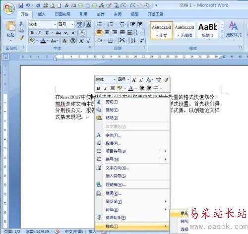 首先點擊“開始”→“快速樣式”→“正文”。接著,選中文字按論文要求設置行距、字號、縮進等。然后,在文字處右擊選擇“樣式/更新‘正文’以匹配所選內容”(圖1),即可按論文要求設置“正文”樣式。