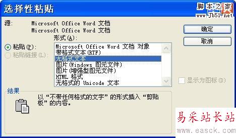 第四步,執行“編輯”→“選擇性粘貼”,打開“選擇性粘貼”對話框,選擇粘貼形式為“無格式文本”,如圖4。