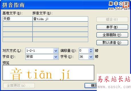 我們現在來增加難度:如果想讓多個漢字的拼音出現在隨后的一個括號里,怎么辦呢?這需要在“拼音指南”對話框中進行設置,單擊“組合”按鈕,原來單個的漢字即集中在一個文本框中,拼音集中在對應的另一個文本框中。下面我們就能對它們動手術了,可以在拼音框添加注解文字,還可以在各字音間添加空格,以避免將來拼音之間距離過近。如圖6。