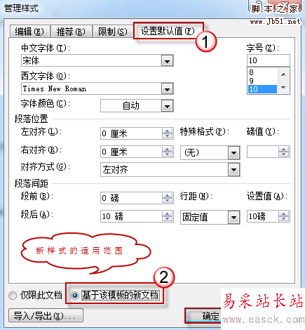 在“管理樣式”窗口中,切換到“設(shè)置默認值”選項卡。我們可以在這里重新設(shè)置文檔的默認格式,包括中西文字體,字號,段落位置,段落間距等。完成設(shè)置后,選擇新樣式的適用范圍,最后單擊“確定”保存設(shè)置就可以了。