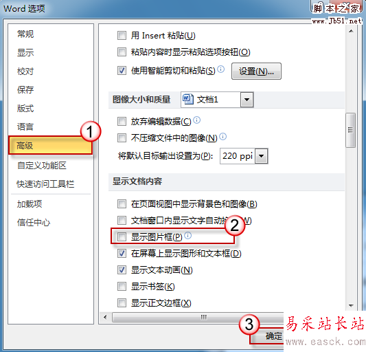 單擊“高級”,然后從右邊細節(jié)窗口找到“顯示文檔內(nèi)容”部分,取消對“顯示圖片框”的勾選 。按“確定”保存更改。