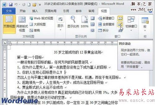 圖2009120314 單擊“并排滾動(dòng)”按鈕小提示:在“視圖”功能區(qū)的“窗口”分組中,還可以進(jìn)行諸如新建窗口、拆分窗口、全部重排等Word2010窗口相關(guān)操作,如圖2009120315所示。