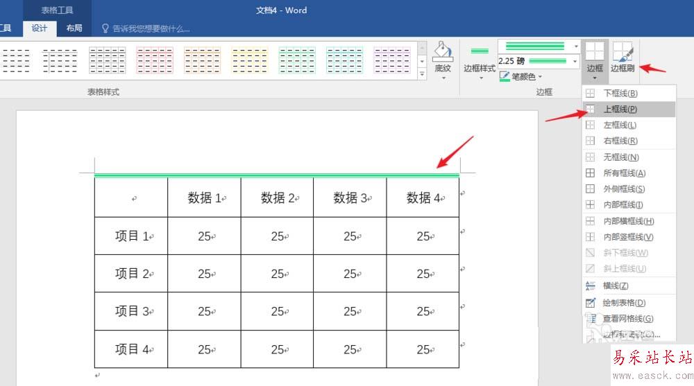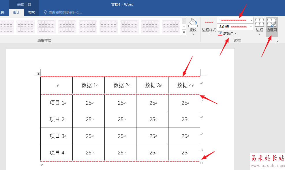 4、光標置于表格,在【表格工具】—【設計】—【邊框】中修改表格邊框樣式。選擇一種邊框樣式、粗細和顏色,則【邊框刷】自動被開啟,鼠標變成一支筆的形狀,然后直接在表格邊框中拖動即可。