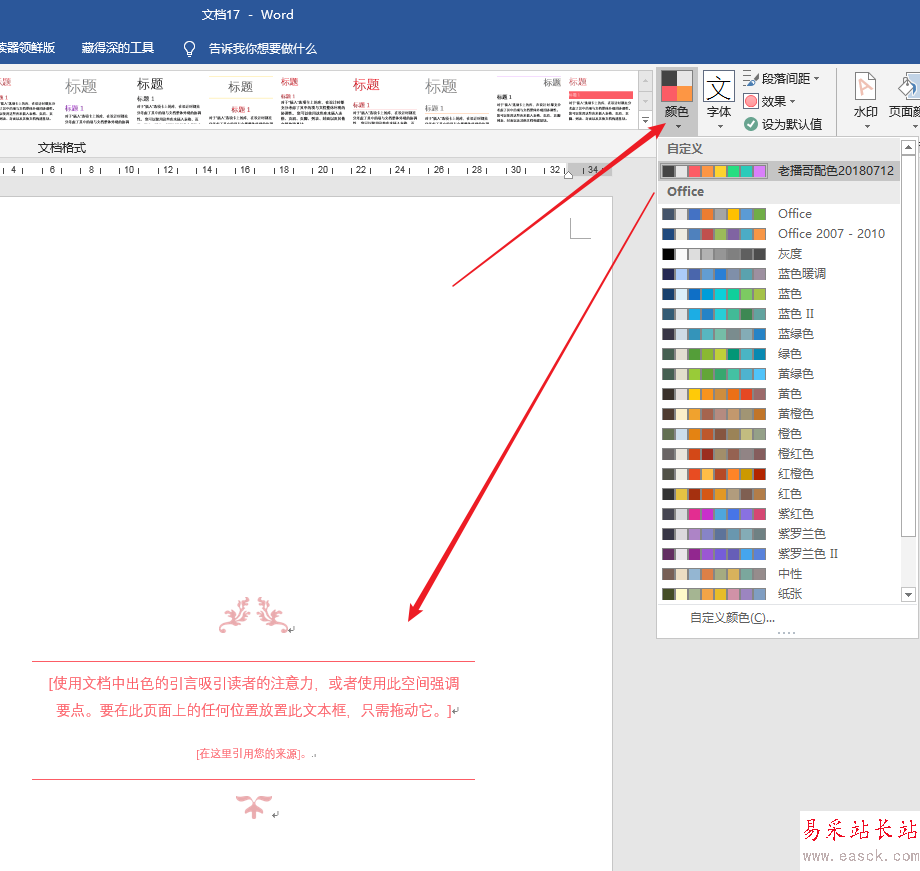 6、此外,內(nèi)置的文本框的顏色會(huì)根據(jù)文檔主題顏色的改變而改變,這樣,就能使用內(nèi)置文本框便能更加提升文檔編輯速度。
