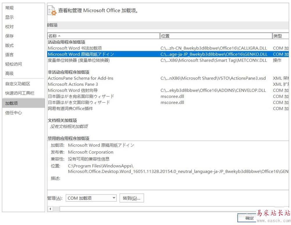 3、取消勾選"Microsoft Word 原稿用紙アドイン",重新打開文件即可,報錯''the resource dll can not be loaded''不再出現