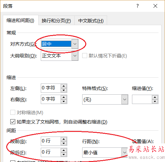 5、將對齊方式改為居中,段前、段后改為0,行距改為最小值。OK,萬事大吉!