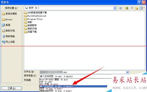 5、在”保存類型“選項出現菜單列表,一定要往下拉,選中”單個文件網頁“,如圖:文件名自己改,小編起了個”實驗文檔“的名,方便大家理解。