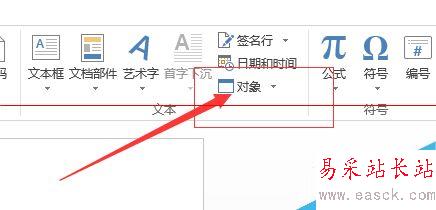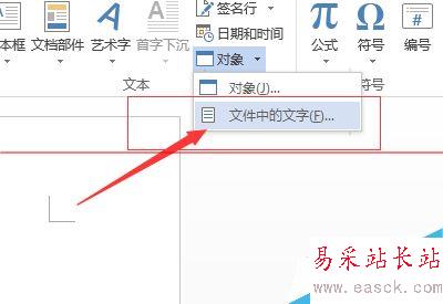 3、在插入選項卡下面找到 對象 點擊對象右邊的 小三角 顯示出下拉選項 然后點擊 文件中的文字