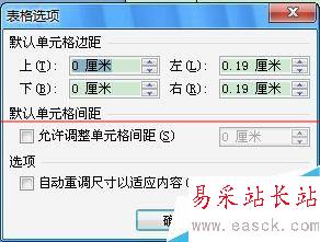 2、表格屬性-選項,在表格選項窗口中查看默認單元格邊距 下:如圖,默認下邊距是0厘米,可以改成0.01或其它非0值,建議選0.01,對表格高度影響最小。