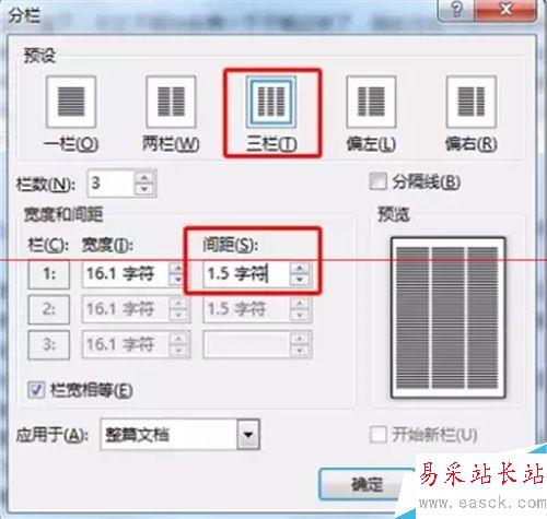5、選中全部文字,將文檔的“分欄”設置為“三欄”,欄間距設置成“1.5字符”。