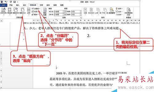 WORD2013怎么給同一文檔設(shè)置不同的紙張方向?通過(guò)在第一頁(yè)末和第二頁(yè)末分別插入分節(jié)符的方法,實(shí)現(xiàn)將這篇文檔第二頁(yè)單獨(dú)設(shè)置為橫向的目的。通過(guò)分節(jié)符,將一篇文檔分成了多節(jié)。每節(jié)都可以設(shè)置成不同的格式。除了分別設(shè)置縱向橫向外,還可以實(shí)現(xiàn)從第二頁(yè)開(kāi)始插入頁(yè)碼,每頁(yè)設(shè)置不同頁(yè)碼等等功能。