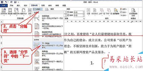 將光標(biāo)定位在第一頁(yè)的最后位置。點(diǎn)擊“分隔符”,選擇“分節(jié)符”中的“下一頁(yè)”