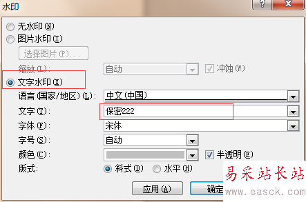 5、在彈出的對話框中選擇“文字水印”,然后修改文字內容,再點確認