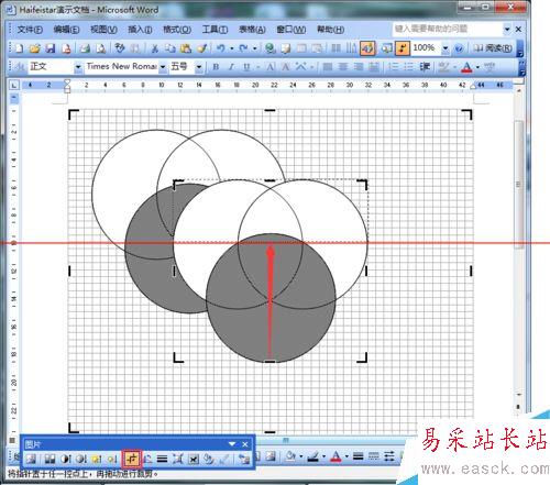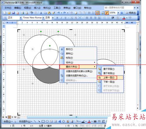 5、選中“左圓”和“右圓”,進入“疊放秩序”選擇“上移一層”達到下圖所示效果。