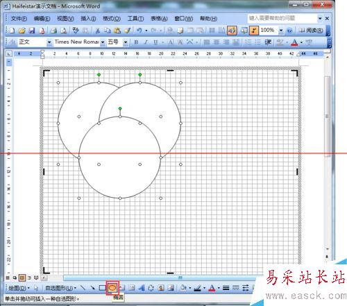 單擊“繪圖”工具欄上的“橢圓”工具,然后按住Shift鍵在畫布內拖拽出一個正圓(以下稱“左圓”),按Ctrl + Shift + 鼠標向右拖拽 復制出一個正圓(以下稱“右圓”),再按Ctrl + Shift + 鼠標向下拖拽 復制出一個正圓(以下稱“下圓”),并調整好三個圓之間的位置(注意圓的相交點),如下圖所示。