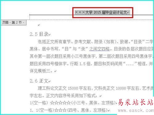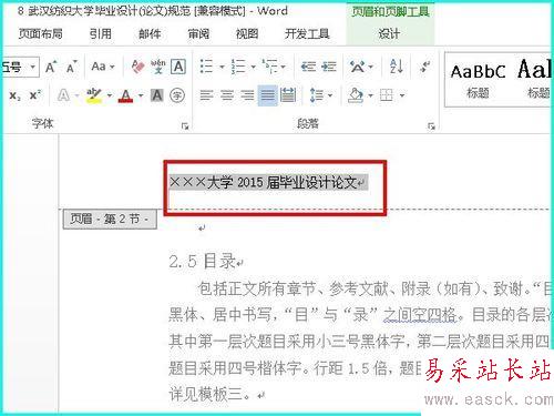 2、用鼠標選中頁眉內容:當文檔進入頁眉編輯狀態后,我們用鼠標將頁眉的內容選中,如下圖紅色框選中處所示。