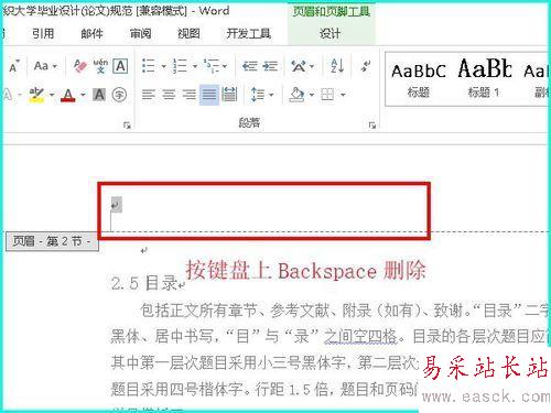 5、敲Backspace鍵刪除頁眉內容:頁眉內容移至左側后下面我們只需刪除頁眉即可,此時我們需要單擊鍵盤上的Backspace鍵頁眉的內容就可刪除。