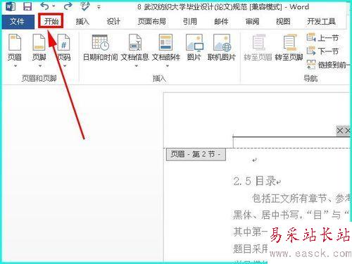 3、單擊菜單欄中的“開始”選項:選中頁眉中的文字后,我們要在文檔的菜單欄找到并單擊“開始”選項其位置見下圖紅色框選中處。