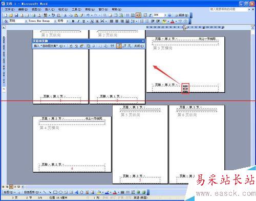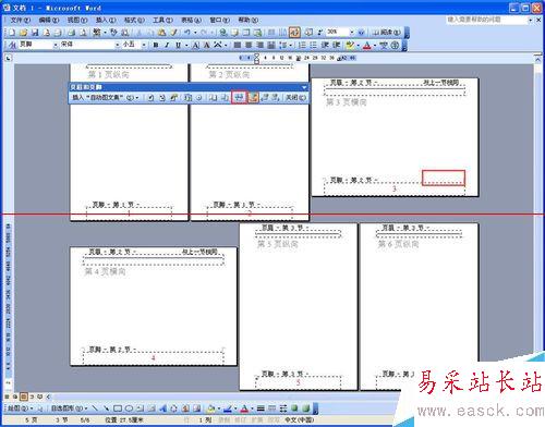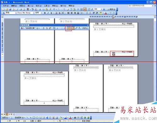 3、插入頁碼之后得到的頁碼效果如下圖所示(此處為便于查看特把頁碼字號放大)。將光標定位到第3頁(即第2節(jié)的首頁),單擊“頁眉和頁腳”工具欄上高亮顯示的“鏈接到前一個”按鈕將其關(guān)閉;同樣需要將光標定位到第5頁進行相同的操作(特別說明并不是需要進入之后的每一頁操作,而只需對與前一節(jié)頁面方向不同的節(jié)的首頁進行設(shè)置)。