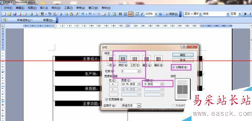 6、單擊上方工具欄中的“格式”,點擊“分欄”,在彈出的對話框中選擇分欄數,勾選“分隔線”,并設定“間隔”為0字符。設置完畢后,單擊“確定”。