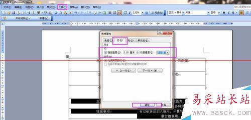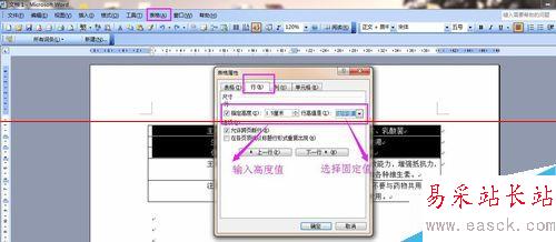 4、選擇表格中的前三行,單擊工具欄上的“表格”,下拉菜單,點擊“表格屬性”,在彈出的對話框中,點擊行。勾選“指定高度”并設置為1.5,行高值為“固定值”。