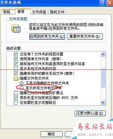 2、點擊“查看”頁簽,找到“隱藏文件和文件夾”選項,將其屬性設置為“顯示所有文件和文件夾”然后確定。