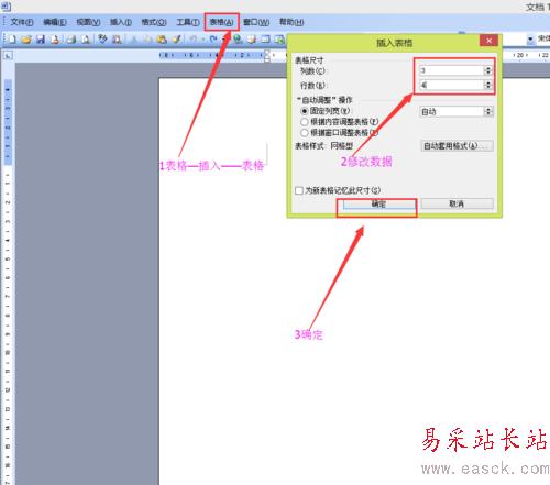 打開Word軟件,插入一個4行3列的表格,先把鼠標定位一個位置,這個位置就是我們插入表格的位置,然后選擇菜單欄的表格——插入——表格——輸入行數列數——確定。