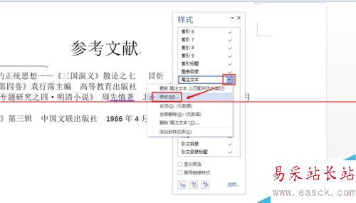 6、然后在【樣式】對話框中下拉右邊的滾動條,找到【尾注文本】,接著點擊【尾注文本】旁邊的下拉三角按鈕,在彈出的下拉菜單中選擇【修改】,如圖所示