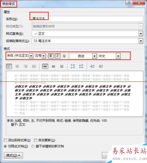 7、最后彈出【修改樣式】對話框,在該對話框中可以一次性次改所有的尾注文本格式,如圖所示,修改完畢后點擊【確定】即可應用于文本。