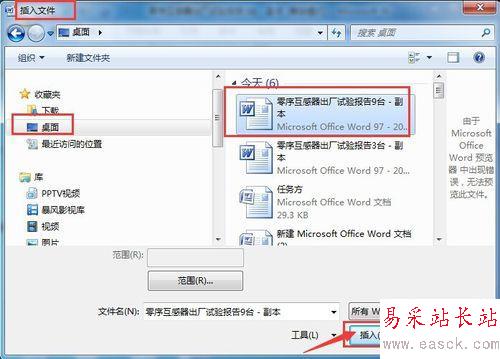 彈出插入文件的對話框,在桌面選擇任務部分的另一個WORD文檔,點擊插入