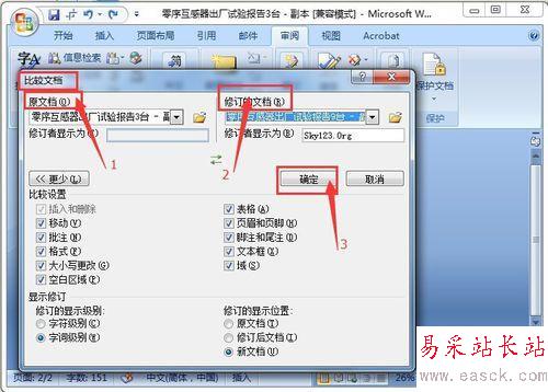 然后彈出比較文檔的對話框來,在這個對話框中,選擇原文檔,修訂文檔通過瀏覽可以選擇出來,點擊確定按鈕,兩個文檔就合并在一起了,可以顯示隱藏原始文檔,僅顯示修訂后的文檔等選擇,看你的需求了