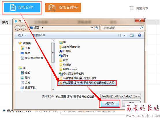 3、在左上方“添加文件”中找到原pdf文件存檔位置,點擊打開按鈕將pdf文件上傳至軟件列表中。