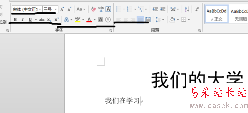 這時,我們就進入正文了,輸入標題,“我們的大學”,點擊鼠標左鍵,覆蓋所有文字,然后,點擊圖2里所示的兩個下拉菜單,就可以選擇你想要的字體,還有字體大小。