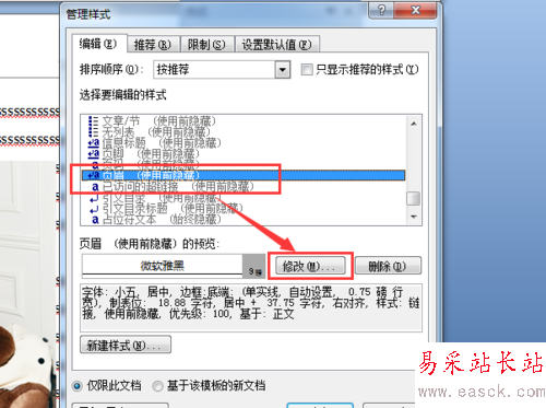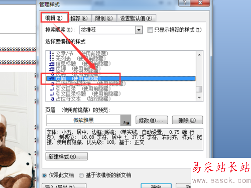 步驟四:在管理樣式界面的“編輯”選項卡中,找到“頁眉”。